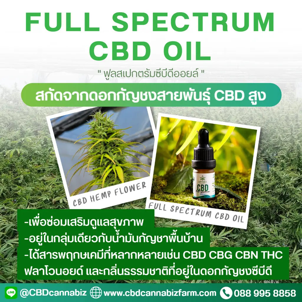 น้ำมันสกัดแบบฟูลสเปกตรัมซีบีดี ที่ดีที่สุดตามวิจัยในปัจจุบัน คือ ฟูลสเปกตรัมซีบีดีเอ็นริชด์ (Full spectrum CBD-Enriched) เพราะมีพฤกษเคมี เช่น ฟลาโวนอย ซึ่งมีคุณสมบัติต่อต้านอนุมูลอิสระ มีกลิ่นธรรมชาติ หรือเนเชอรัลเทอร์ปีนส์ ที่ช่วยเสริมฤทธิ์กระตุ้นเนื้อสารสำคัญต่าง ๆ ให้ทำงานร่วมกัน และมีสารแคนนาบินอยที่หลากหลายกว่า 100 ชนิด เช่น CBDa CBD CBG CBN THC โดยมีสัดส่วนวัดค่าจาก CBD:THC อยู่ที่ 20-25 ส่วน ต่อ THC 1 ส่วน (CBD 20/ THC 1) ซึ่งเป็นสัดส่วนที่ทรงประสิทธิภาพต่อการใช้งาน เพื่อให้ได้ผลแบบที่ว่า “หยดน้อยได้ผลมาก” เพราะการทำงานแบบเสริมฤทธิ์ร่วมกันของเนื้อสารสำคัญต่าง ๆ รวมเรียกว่า อองทูราจเอฟเฟค (Entourage effect) THC หรือสารเมาที่เราแอบกังวลกัน จริง ๆ แล้วก็มีส่วนดีอยู่บ้างถ้าใช้ในปริมาณน้อย ๆ ในเกณฑ์ที่ปลอดภัย จากการทดลองพบว่า THC มีส่วนช่วยให้สารแคนนาบินอย อย่างสาร CBD ถูกดูดซึมไปใช้งานได้ดียิ่งขึ้น ซึ่งน้ำมันสกัดของ CBD Cannabiz Farm เป็นน้ำมันสกัดแบบฟูลสเปกตรัมซีบีดีเอ็นริชด์ที่มีสัดส่วนอยู่ที่ 24/1 (CBD/THC) สารเมา หรือ THC ต่ำกว่า 0.2% ตามที่กฎหมายกำหนด จึงไม่จัดเป็นยาเสพติด ซื้อขาย ครอบครองได้จ้าาา