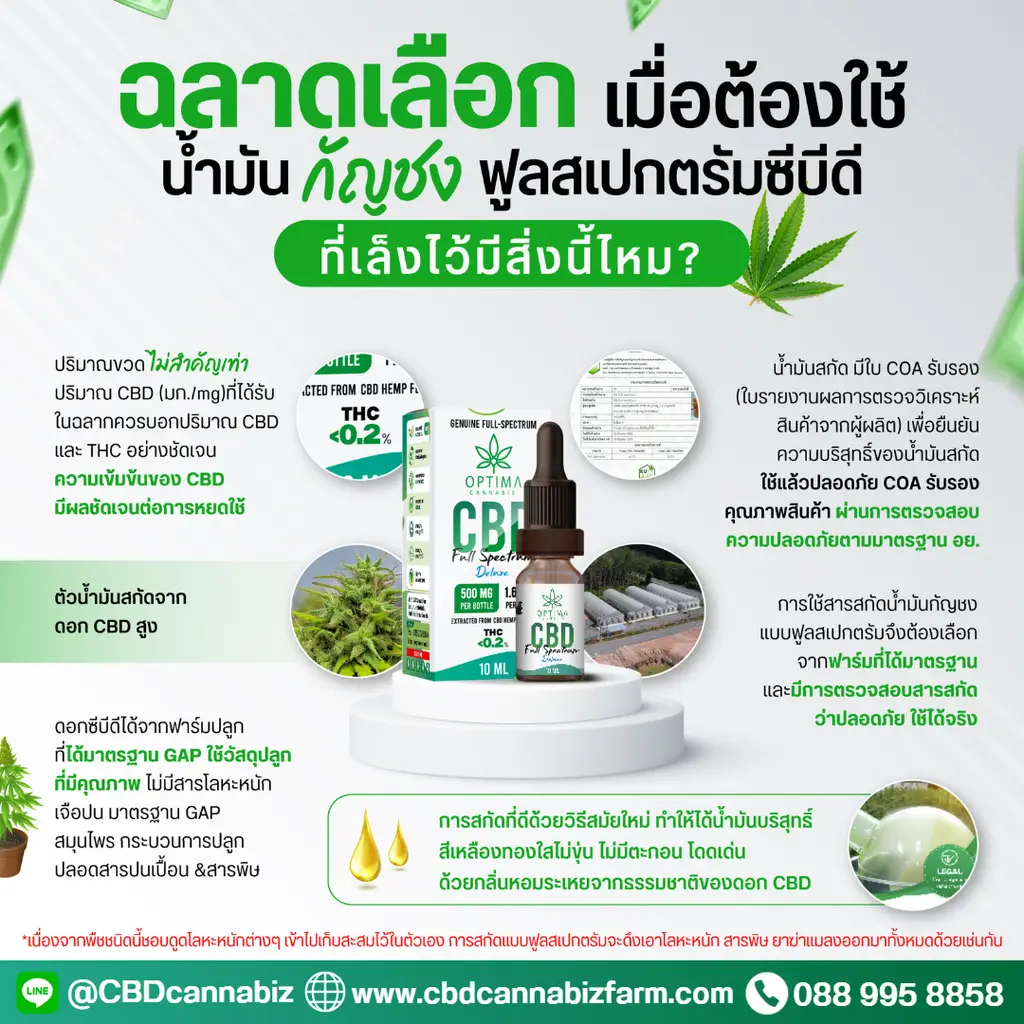 น้ำมันจะเป็นสีเหลืองทองใส ไม่มีตะกอน เพราะผ่านเครื่องมือการผลิตสกัดที่ทันสมัย จึงไม่ดึงขี้ผึ้งและสารสีเขียว หรือคลอโรฟิลล์ ในดอก CBD ออกมาด้วย และด้วยเทคโนโลยีสมัยใหม่สามารถสกัดดึงเอาพฤกษเคมีที่หลากหลาย สารแคนนาบินอย ทั้งหมดที่มีอยู่ในช่อดอกออกมาได้อย่างครบถ้วน รวมถึงยาฆ่าแมลง และสารโลหะหนักต่าง ๆ เพราะสารพิษเหล่านี้จะล่องลอยปะปนรวมตัวกับพฤกษเคมี และสารแคนนาบินอยต่าง ๆ อยู่ในน้ำมัน ***ดังนั้นการเลือกน้ำมันแบบสกัดฟูลสเปกตรัมซีบีดีที่ดีและให้ประโยชน์ได้จริง จึงควรดูให้ลึกถึงฟาร์มที่ผลิตปลูก ทาง CBD Cannabiz Farm เราได้รับการตรวจรับรองการปลูกจากกรมวิชาการเกษตร ผ่านมาตรฐาน GMP การปลูกพืชสมุนไพรที่ดี รับรองความปลอดภัย ไม่มีการใช้ยาเคมีฆ่าแมลง และกำจัดเชื้อราในแปลงปลูกรวมถึงการจัดเก็บช่อดอก และยังใส่ใจเลือกใช้วัสดุปลูก กัญชงซีบีดีที่ได้มาตรฐาน ตรวจรับรองว่าปลอดจากสารโลหะหนัก เช่น สารหนู ตะกั่ว ปรอท และแคดเมียม